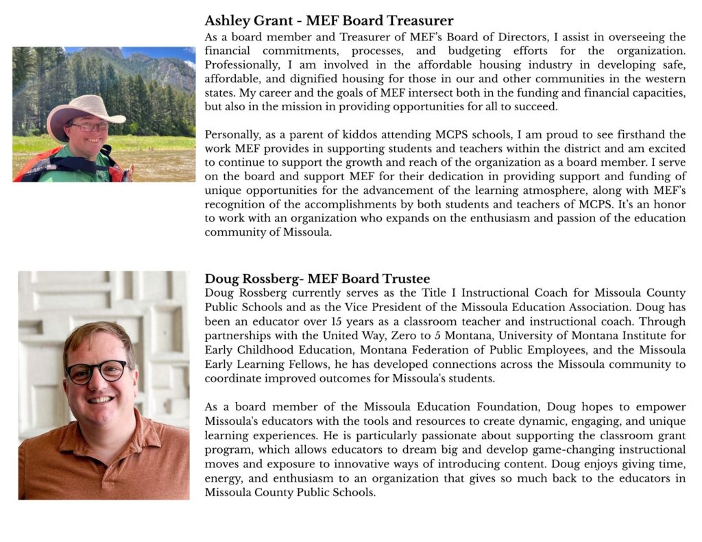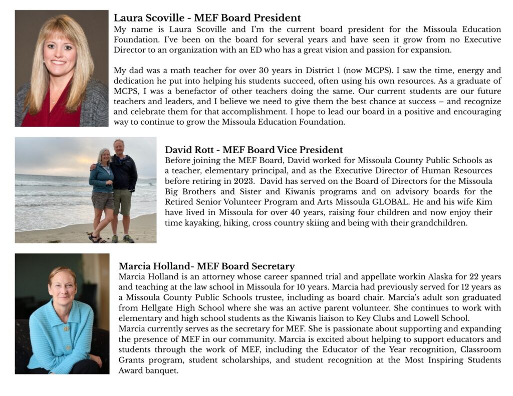 The Missoula Education Foundation is governed by a Board of Directors. We invite you to learn more about our current Board Members: